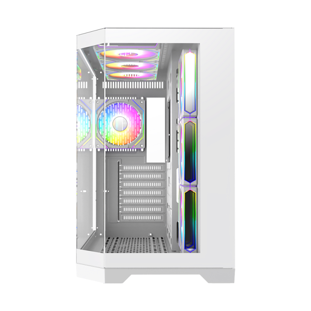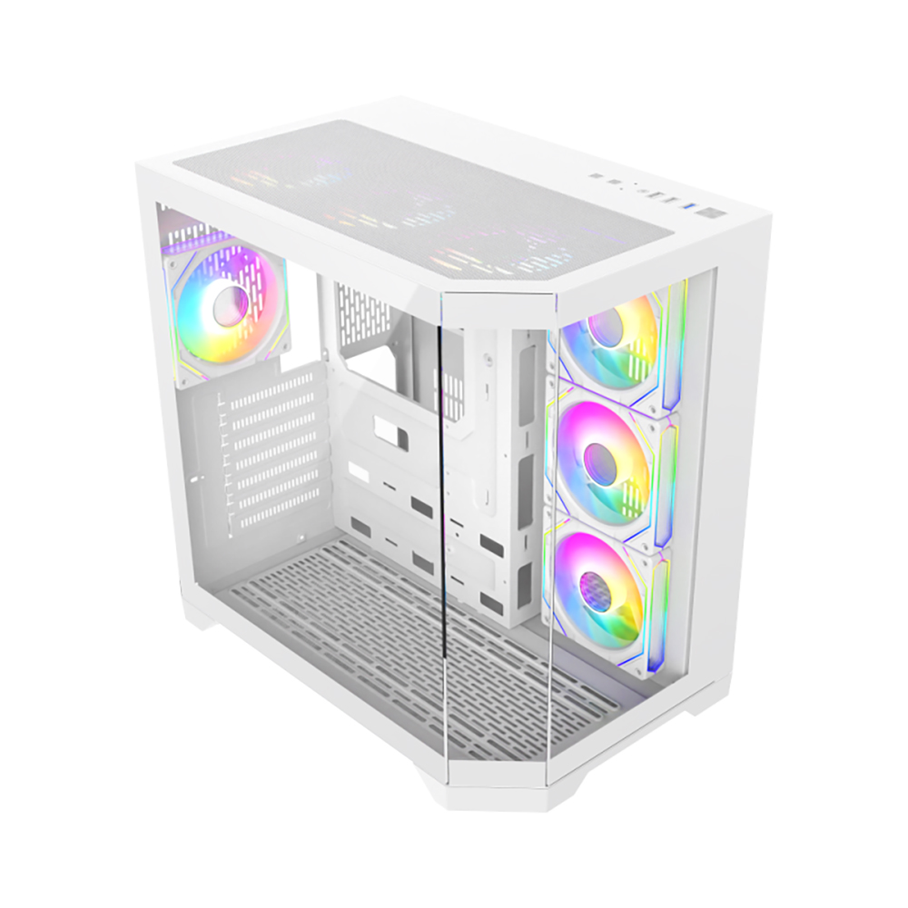 Предниот I/O панел вклучува 1 × USB 3.0, 2 × USB 2.0, HD Audio приклучок и копчиња за Power/Reset. Куќиштето поддржува до 10 вентилатори преку ARGB/PWM хаб и синхронизација на светлосните ефекти со матичната плоча.