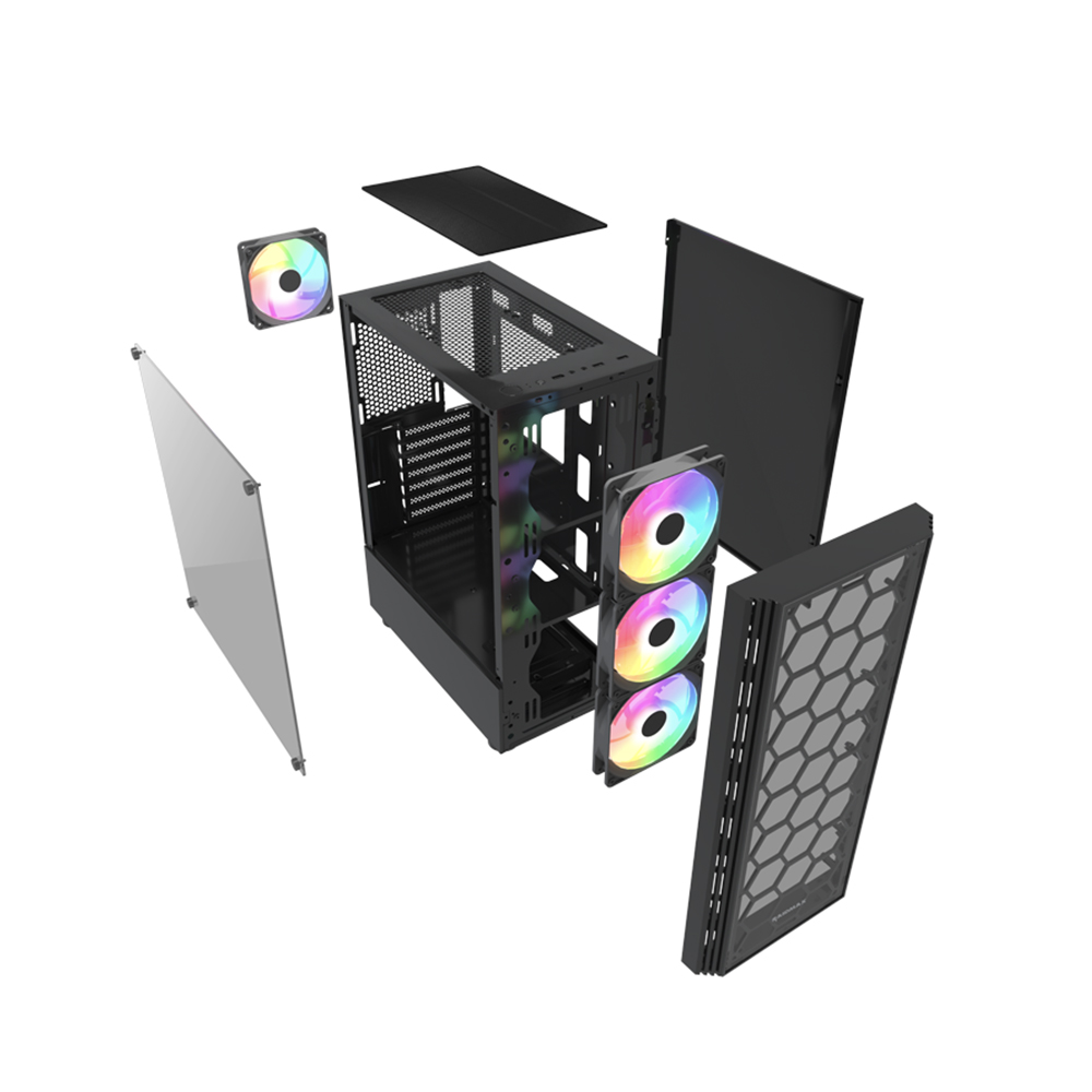 Raidmax Vector V152 е mid-tower компјутерско куќиште кое нуди комбинација од модерен дизајн и практичност. Опремено е со четири претходно инсталирани 120 мм RGB вентилатори, кои обезбедуваат ефикасно ладење и истовремено додаваат визуелна привлечност со своите светлосни ефекти.