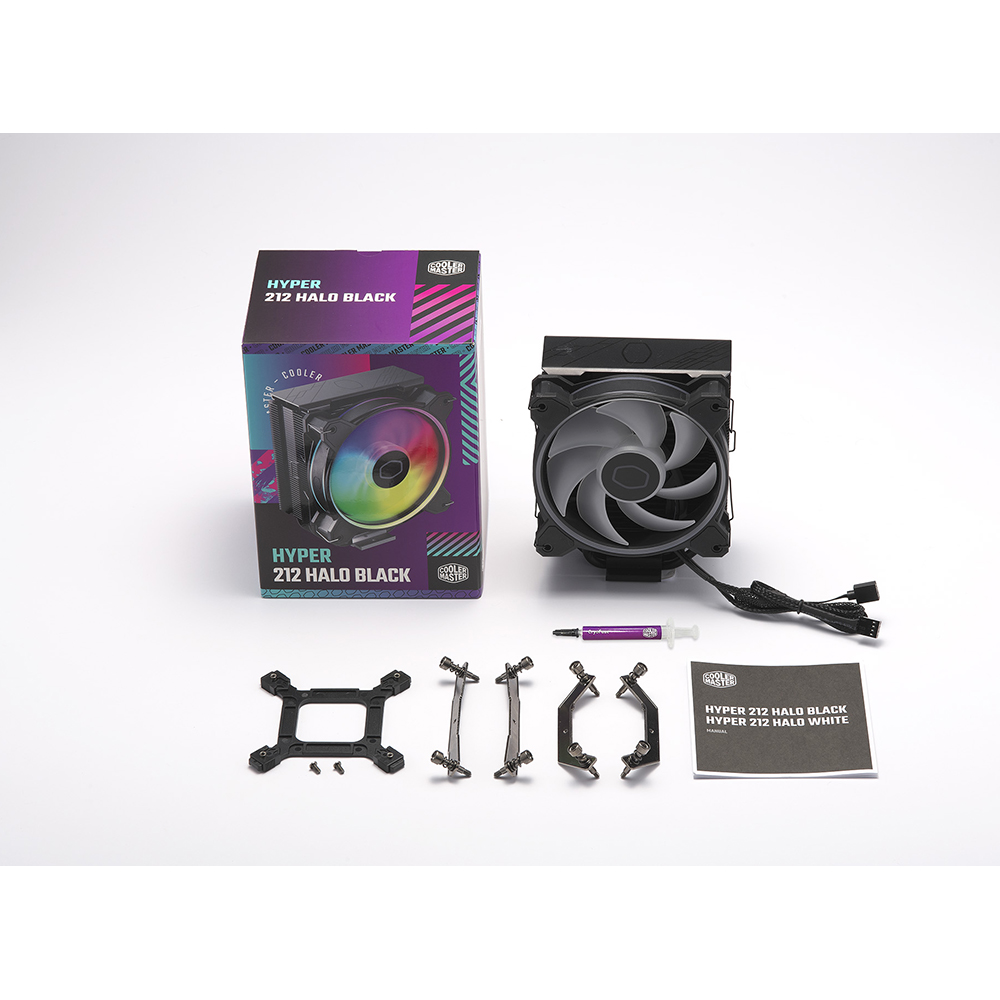 Cooler Master Hyper 212 Halo Black е воздушен процесорски кулер кој комбинира ефикасни перформанси со модерен дизајн. Опремен е со еден 120mm MF120 Halo² вентилатор со ARGB осветлување, што овозможува прилагодливи светлосни ефекти и компатибилност со повеќето системи за осветлување на матичните плочи.