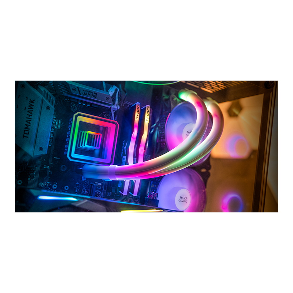 Системот поддржува TDP до 500W, што го прави идеален за гејминг, продуктивност и оверклок, одржувајќи ниски температури и при најголеми оптоварувања. Цревата се издржливи, обложени со тефлон и дополнети со ARGB осветлување за модерен изглед.