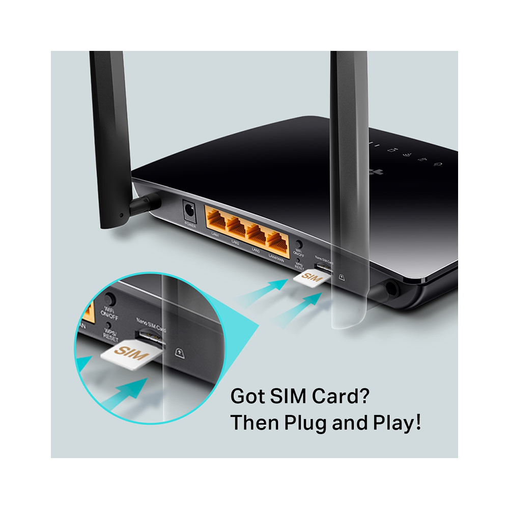 TP-Link TL-MR6400 е 4G LTE рутер кој овозможува интернет конекција преку мобилна мрежа, наменет за домаќинства и мали канцеларии без фиксна интернет инфраструктура.