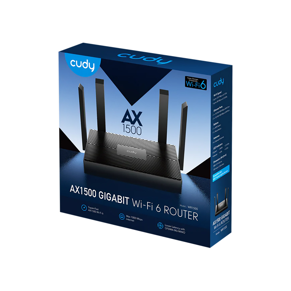 Cudy WR1500 AX1500 е Wi-Fi 6 рутер (802.11ax) кој нуди двојнобендска безжична конекција со максимални брзини до 1201 Mbps на 5 GHz и 300 Mbps на 2.4 GHz, што дава вкупна брзина од 1.5 Gbps (AX1500).